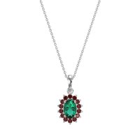 This Lab Emerald and Ruby Necklace is casted in Platinum. This Women’s Halo necklace features exceptionally fine gemstones, on par with those found in the world's most exclusive boutiques and among the top 10% available globally. Oval Pendant Featuring A Central Oval Stone Encircled By A Halo Of Smaller Round Stones. This necklace comes with a complimentary 18-inch chain. Enjoy the confidence of our 30-day, stress-free return policy—with return shipping fully covered. Each piece is also accompanied by a Lifetime Warranty, ensuring lasting beauty and peace of mind.