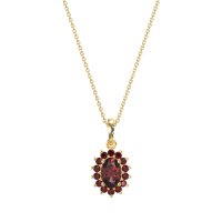 This Lab Ruby and Ruby Necklace is casted in 14k Yellow Gold. This Women’s Halo necklace features exceptionally fine gemstones, on par with those found in the world's most exclusive boutiques and among the top 10% available globally. Oval Pendant Featuring A Central Oval Stone Encircled By A Halo Of Smaller Round Stones. This necklace comes with a complimentary 18-inch chain. Enjoy the confidence of our 30-day, stress-free return policy—with return shipping fully covered. Each piece is also accompanied by a Lifetime Warranty, ensuring lasting beauty and peace of mind.