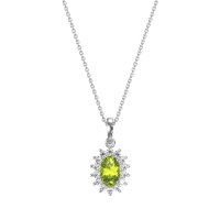 This Peridot and Lab Diamond Necklace is casted in Platinum. This Women’s Halo necklace features exceptionally fine gemstones, on par with those found in the world's most exclusive boutiques and among the top 10% available globally. Oval Pendant Featuring A Central Oval Stone Encircled By A Halo Of Smaller Round Stones. This necklace comes with a complimentary 18-inch chain. Enjoy the confidence of our 30-day, stress-free return policy—with return shipping fully covered. Each piece is also accompanied by a Lifetime Warranty, ensuring lasting beauty and peace of mind.