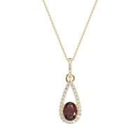 This Garnet and Lab Diamond Necklace is casted in 14k Yellow Gold. This Women’s Fashion necklace features exceptionally fine gemstones, on par with those found in the world's most exclusive boutiques and among the top 10% available globally. Teardrop Pendant Outlined with Shimmering Accents. A Captivating Design with A Prominent Oval Center Stone, Surrounded By A Tear Drop Halo. This necklace comes with a complimentary 18-inch chain. Enjoy the confidence of our 30-day, stress-free return policy—with return shipping fully covered. Each piece is also accompanied by a Lifetime Warranty, ensuring lasting beauty and peace of mind.