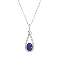 This Lab Blue Sapphire and Lab Diamond Necklace is casted in 18k White Gold. This Women’s Fashion necklace features exceptionally fine gemstones, on par with those found in the world's most exclusive boutiques and among the top 10% available globally. Teardrop Pendant Outlined with Shimmering Accents. A Captivating Design with A Prominent Oval Center Stone, Surrounded By A Tear Drop Halo. This necklace comes with a complimentary 18-inch chain. Enjoy the confidence of our 30-day, stress-free return policy—with return shipping fully covered. Each piece is also accompanied by a Lifetime Warranty, ensuring lasting beauty and peace of mind.