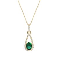 This Lab Emerald and Lab Diamond Necklace is casted in 14k Yellow Gold. This Women’s Fashion necklace features exceptionally fine gemstones, on par with those found in the world's most exclusive boutiques and among the top 10% available globally. Teardrop Pendant Outlined with Shimmering Accents. A Captivating Design with A Prominent Oval Center Stone, Surrounded By A Tear Drop Halo. This necklace comes with a complimentary 18-inch chain. Enjoy the confidence of our 30-day, stress-free return policy—with return shipping fully covered. Each piece is also accompanied by a Lifetime Warranty, ensuring lasting beauty and peace of mind.
