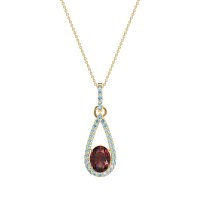 This Lab Ruby and Aquamarine Necklace is casted in 14k Yellow Gold. This Women’s Fashion necklace features exceptionally fine gemstones, on par with those found in the world's most exclusive boutiques and among the top 10% available globally. Teardrop Pendant Outlined with Shimmering Accents. A Captivating Design with A Prominent Oval Center Stone, Surrounded By A Tear Drop Halo. This necklace comes with a complimentary 18-inch chain. Enjoy the confidence of our 30-day, stress-free return policy—with return shipping fully covered. Each piece is also accompanied by a Lifetime Warranty, ensuring lasting beauty and peace of mind.