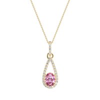 This Pink Tourmaline and Lab Diamond Necklace is casted in 18k Yellow Gold. This Women’s Fashion necklace features exceptionally fine gemstones, on par with those found in the world's most exclusive boutiques and among the top 10% available globally. Teardrop Pendant Outlined with Shimmering Accents. A Captivating Design with A Prominent Oval Center Stone, Surrounded By A Tear Drop Halo. This necklace comes with a complimentary 18-inch chain. Enjoy the confidence of our 30-day, stress-free return policy—with return shipping fully covered. Each piece is also accompanied by a Lifetime Warranty, ensuring lasting beauty and peace of mind.