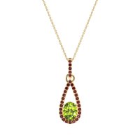 This Peridot and Ruby Necklace is casted in 14k Yellow Gold. This Women’s Fashion necklace features exceptionally fine gemstones, on par with those found in the world's most exclusive boutiques and among the top 10% available globally. Teardrop Pendant Outlined with Shimmering Accents. A Captivating Design with A Prominent Oval Center Stone, Surrounded By A Tear Drop Halo. This necklace comes with a complimentary 18-inch chain. Enjoy the confidence of our 30-day, stress-free return policy—with return shipping fully covered. Each piece is also accompanied by a Lifetime Warranty, ensuring lasting beauty and peace of mind.