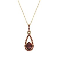 This Ruby Fashion Necklace is casted in 14k Yellow Gold. We use only exceptionally fine gemstones, truly on par with those found in the world's most exclusive boutiques and representing the top 10% available globally. Teardrop Pendant Outlined with Shimmering Accents. A Captivating Design with A Prominent Oval Center Stone, Surrounded By A Tear Drop Halo. You'll get a complimentary 18-inch chain with every necklace. Plus, enjoy a 30-day, hassle-free return policy (we even cover return shipping!) and a Lifetime Warranty for peace of mind.