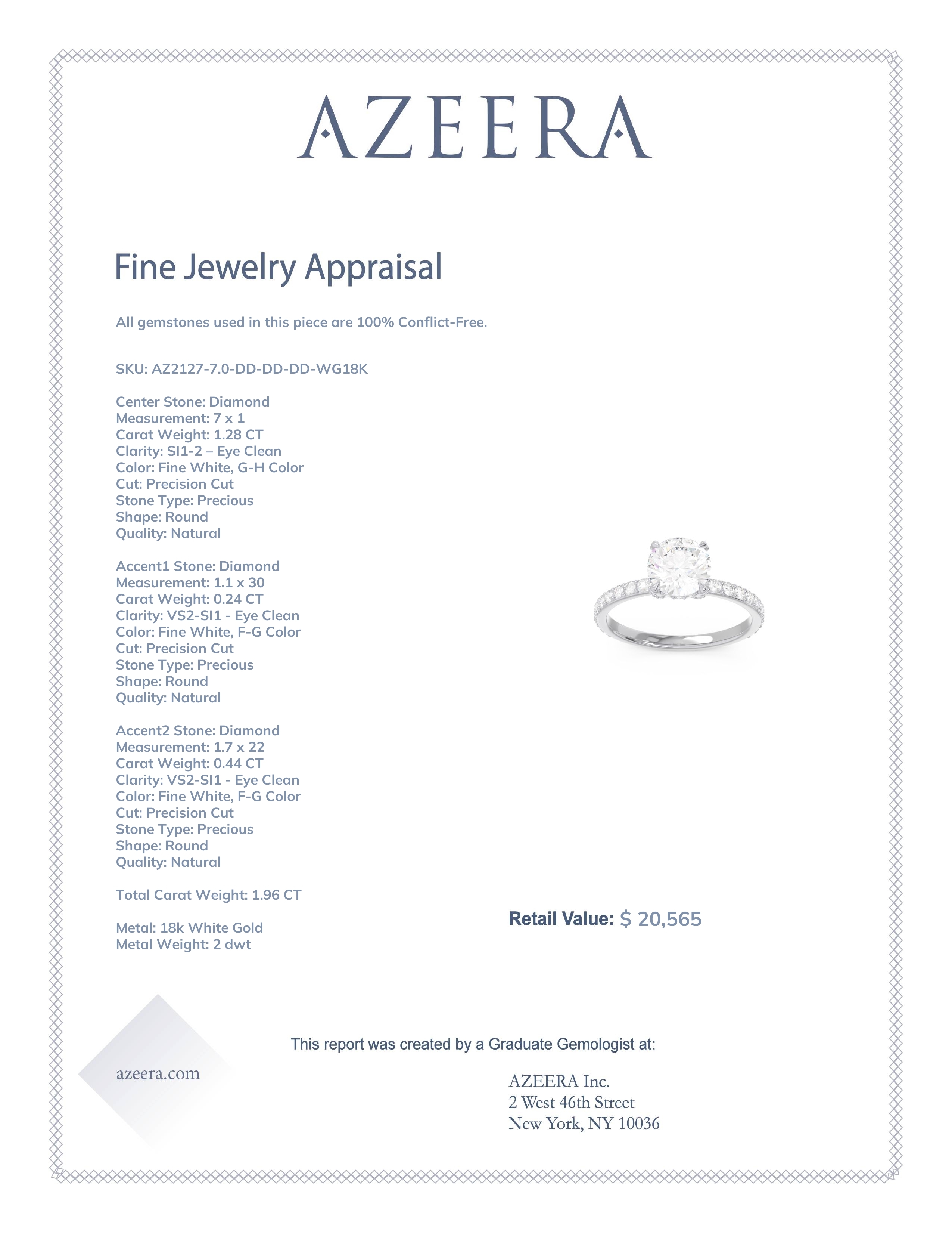 This 18k White Gold Diamond ring features a Round Diamond stone, found across the finest boutiques in the world. We only use gems that are within the top 10% of material available. This ring can be worn as an Diamond engagement ring, or can also be added to your collection of gemstone rings. This Ring Features A Large Round Brilliant Gem in A Raised 4-claw Prong Setting. Smaller Rounds in A Pave Setting Decorate The Basket Below The Center Stone And Also Cascade Three Quarters Of The Way Down Shank. Customize And Build Your Own Engagement Ring By Selecting The Gems And Metals Of Your Choice. We offer Free Shipping and Free Returns, along with a Free Resize. This ring also comes with a lifetime warranty which covers the integrity of our workmanship forever.