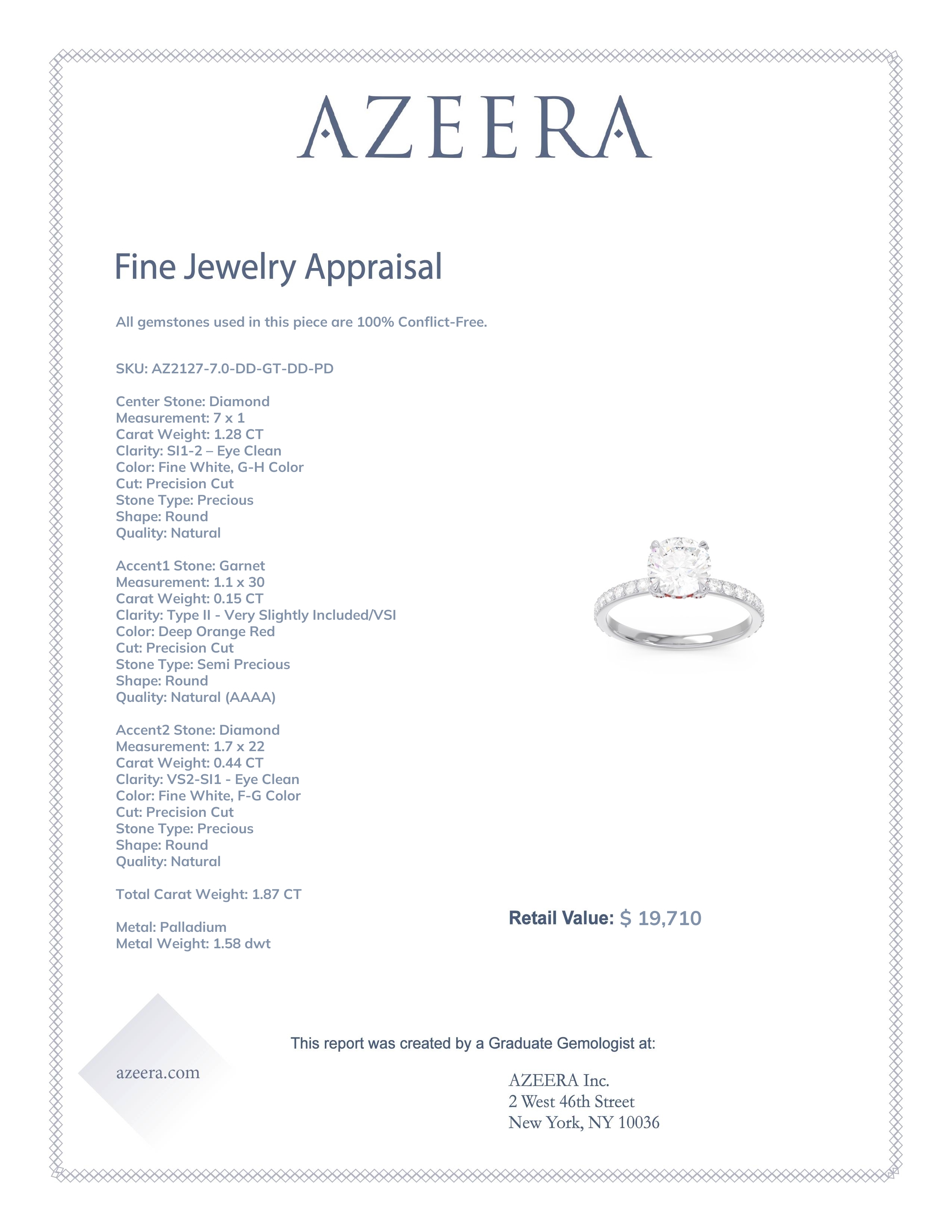This Palladium Diamond ring features a Round Diamond, along with fine quality Garnet. This Ring Features A Large Round Brilliant Gem in A Raised 4-claw Prong Setting. Smaller Rounds in A Pave Setting Decorate The Basket Below The Center Stone And Also Cascade Three Quarters Of The Way Down Shank. Customize And Build Your Own Engagement Ring By Selecting The Gems And Metals Of Your Choice. We only use the top 10% of gems available, those found in the finest jewelry shops across the world. This Diamond engagement ring can also be worn as an Diamond and Garnet gemstone ring and added to your collection! Enjoy Free Shipping and Returns, Free Resize and a lifetime warranty.