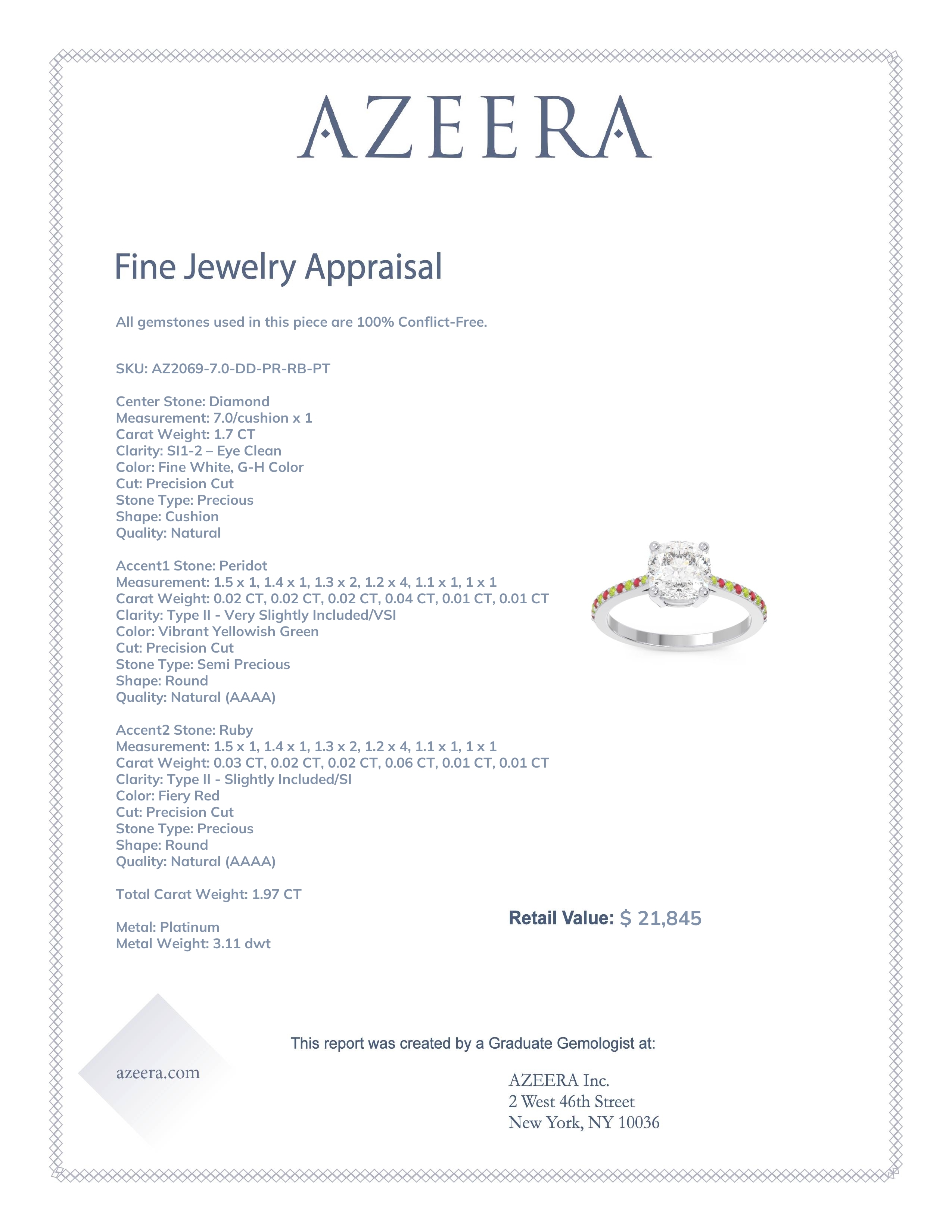 This Platinum Diamond ring features a AAAA Cushion Diamond, along with Peridot and Ruby. This Diamond engagement ring can even be added to your collection of gemstone rings. Make this stunning Diamond engagement ring your own. This Ring Features A Large Cushion Cut Gem Accented with A Pave Of Small Rounds Around The Shank. This product comes with Free Shipping, Free Returns, Free Resize and a lifetime warranty. Choose your favorite metal and gem combination and experience the joy of customization.
