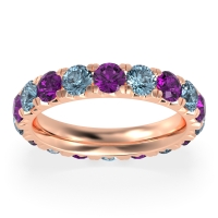 This Amethyst wedding ring is casted in 14K Rose Gold and set with fine quality Amethyst and Aquamarine. All of the gemstones we use are of the top 10% available, those found in fine quality boutiques across the world. This Amethyst wedding band can also be added to your collection of minimalist Amethyst rings. The Beautiful Eternity Band Features Pave Set Round Going All The Way Around. Free shipping, returns, resizing, and a lifetime warranty ensure you love your purchase.