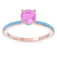 This 18K Rose Gold Pink Tourmaline ring features a AAAA Round Pink Tourmaline, along with fine quality Swiss Blue Topaz. This Ring Features A Large Round Brilliant in A Raised 4 Claw Prong Setting Accented with A Ring Of Smaller Rounds At The Base Of The Center Stone And Around The Shank. We only use the top 10% of gems available, those found in the finest jewelry shops across the world. This Pink Tourmaline engagement ring can also be worn as an Pink Tourmaline and Swiss Blue Topaz gemstone ring and added to your collection! Enjoy Free Shipping and Returns, Free Resize and a lifetime warranty.