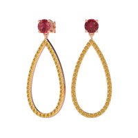 These Ruby earrings and made in 18K Rose Gold with top quality Natural Ruby and Citrine gemstones. These Elegant Dangling Earrings Feature A Brilliant Round Stud At The Top, From Which Suspends A Graceful, Open Pear-shaped (or Teardrop) Outline. The Pear-shaped Frame Is Entirely Adorned With Sparkling Pave-set Gemstones, Creating A Continuous Line Of Shimmer. Free shipping, returns, and a lifetime warranty make luxury worry-free