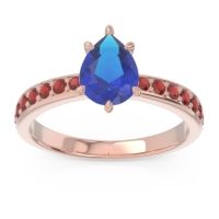 This 18K Rose Gold Blue Sapphire ring features a AAAA Pear Blue Sapphire, along with fine quality Garnet. This Ring Features A Large Pear Shape Gem Surrounded By 6 Claw Prongs in A Raised Setting with Smaller Rounds Cascading Half Way Down The Tapered Shank. We only use the top 10% of gems available, those found in the finest jewelry shops across the world. This Blue Sapphire engagement ring can also be worn as an Blue Sapphire and Garnet gemstone ring and added to your collection! Enjoy Free Shipping and Returns, Free Resize and a lifetime warranty.