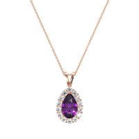 This Amethyst and Lab Diamond Necklace is casted in 14K Rose Gold. This Women’s Halo necklace features exceptionally fine gemstones, on par with those found in the world's most exclusive boutiques and among the top 10% available globally. Classic Pendant Featuring A Pear-shaped Center Stone Embraced By A Classic Halo Of Smaller Stones. This necklace comes with a complimentary 18-inch chain. Enjoy the confidence of our 30-day, stress-free return policy—with return shipping fully covered. Each piece is also accompanied by a Lifetime Warranty, ensuring lasting beauty and peace of mind.