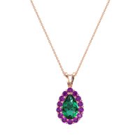 This Emerald and Amethyst Necklace is casted in 14K Rose Gold. This Women’s Halo necklace features exceptionally fine gemstones, on par with those found in the world's most exclusive boutiques and among the top 10% available globally. Classic Pendant Featuring A Pear-shaped Center Stone Embraced By A Classic Halo Of Smaller Stones. This necklace comes with a complimentary 18-inch chain. Enjoy the confidence of our 30-day, stress-free return policy—with return shipping fully covered. Each piece is also accompanied by a Lifetime Warranty, ensuring lasting beauty and peace of mind.