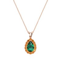 This Emerald and Citrine Necklace is casted in 14K Rose Gold. This Women’s Halo necklace features exceptionally fine gemstones, on par with those found in the world's most exclusive boutiques and among the top 10% available globally. Classic Pendant Featuring A Pear-shaped Center Stone Embraced By A Classic Halo Of Smaller Stones. This necklace comes with a complimentary 18-inch chain. Enjoy the confidence of our 30-day, stress-free return policy—with return shipping fully covered. Each piece is also accompanied by a Lifetime Warranty, ensuring lasting beauty and peace of mind.