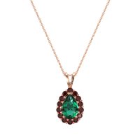 This Emerald and Ruby Necklace is casted in 14K Rose Gold. This Women’s Halo necklace features exceptionally fine gemstones, on par with those found in the world's most exclusive boutiques and among the top 10% available globally. Classic Pendant Featuring A Pear-shaped Center Stone Embraced By A Classic Halo Of Smaller Stones. This necklace comes with a complimentary 18-inch chain. Enjoy the confidence of our 30-day, stress-free return policy—with return shipping fully covered. Each piece is also accompanied by a Lifetime Warranty, ensuring lasting beauty and peace of mind.