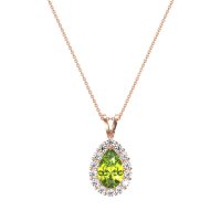 This Peridot and Lab Diamond Necklace is casted in 14K Rose Gold. This Women’s Halo necklace features exceptionally fine gemstones, on par with those found in the world's most exclusive boutiques and among the top 10% available globally. Classic Pendant Featuring A Pear-shaped Center Stone Embraced By A Classic Halo Of Smaller Stones. This necklace comes with a complimentary 18-inch chain. Enjoy the confidence of our 30-day, stress-free return policy—with return shipping fully covered. Each piece is also accompanied by a Lifetime Warranty, ensuring lasting beauty and peace of mind.