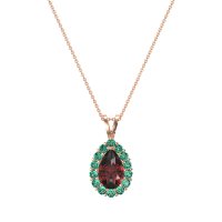This Ruby and Emerald Necklace is casted in 14K Rose Gold. This Women’s Halo necklace features exceptionally fine gemstones, on par with those found in the world's most exclusive boutiques and among the top 10% available globally. Classic Pendant Featuring A Pear-shaped Center Stone Embraced By A Classic Halo Of Smaller Stones. This necklace comes with a complimentary 18-inch chain. Enjoy the confidence of our 30-day, stress-free return policy—with return shipping fully covered. Each piece is also accompanied by a Lifetime Warranty, ensuring lasting beauty and peace of mind.