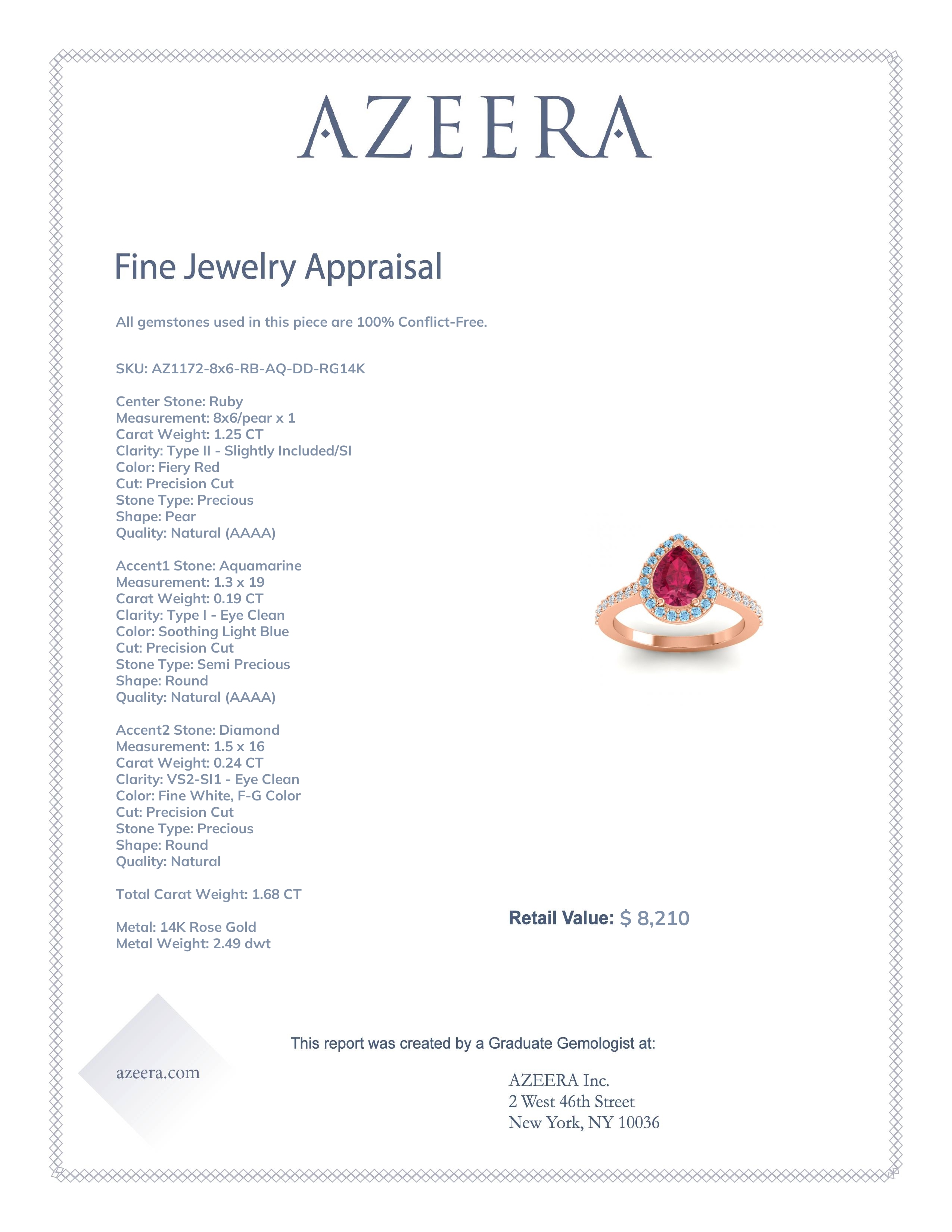 This 14K Rose Gold Ruby ring features a Pear Ruby, along with Aquamarine and Diamond. This Ruby engagement ring can even be added to your collection of gemstone rings. Make this stunning Ruby engagement ring your own. This Stylish Design Of This Ring Wonderfully Compliments The Sparkle Of Its Gem. Your Pear Shape Colored Stone Sits in A 3 Prong Cathedral Setting with Round Brilliants Cascading Down The Sides Of The Band. This product comes with Free Shipping, Free Returns, Free Resize and a lifetime warranty. Choose your favorite metal and gem combination and experience the joy of customization.