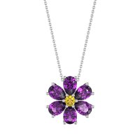 This Amethyst and Citrine Necklace is casted in 14k White Gold. This Women’s Fashion necklace features exceptionally fine gemstones, on par with those found in the world's most exclusive boutiques and among the top 10% available globally. This Floral Pendant Features A Central Round Stone Surrounded By Pear-shaped Stones, Resembling Delicate Petals. This necklace comes with a complimentary 18-inch chain. Enjoy the confidence of our 30-day, stress-free return policy—with return shipping fully covered. Each piece is also accompanied by a Lifetime Warranty, ensuring lasting beauty and peace of mind.
