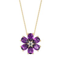 This Amethyst and Lab Diamond Necklace is casted in 14k Yellow Gold. This Women’s Fashion necklace features exceptionally fine gemstones, on par with those found in the world's most exclusive boutiques and among the top 10% available globally. This Floral Pendant Features A Central Round Stone Surrounded By Pear-shaped Stones, Resembling Delicate Petals. This necklace comes with a complimentary 18-inch chain. Enjoy the confidence of our 30-day, stress-free return policy—with return shipping fully covered. Each piece is also accompanied by a Lifetime Warranty, ensuring lasting beauty and peace of mind.