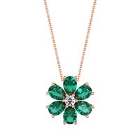 This Emerald and Lab Diamond Necklace is casted in 18K Rose Gold. This Women’s Fashion necklace features exceptionally fine gemstones, on par with those found in the world's most exclusive boutiques and among the top 10% available globally. This Floral Pendant Features A Central Round Stone Surrounded By Pear-shaped Stones, Resembling Delicate Petals. This necklace comes with a complimentary 18-inch chain. Enjoy the confidence of our 30-day, stress-free return policy—with return shipping fully covered. Each piece is also accompanied by a Lifetime Warranty, ensuring lasting beauty and peace of mind.