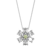 This Lab Diamond and Peridot Necklace is casted in 14k White Gold. This Women’s Fashion necklace features exceptionally fine gemstones, on par with those found in the world's most exclusive boutiques and among the top 10% available globally. This Floral Pendant Features A Central Round Stone Surrounded By Pear-shaped Stones, Resembling Delicate Petals. This necklace comes with a complimentary 18-inch chain. Enjoy the confidence of our 30-day, stress-free return policy—with return shipping fully covered. Each piece is also accompanied by a Lifetime Warranty, ensuring lasting beauty and peace of mind.