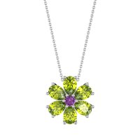 This Peridot and Amethyst Necklace is casted in 14k White Gold. This Women’s Fashion necklace features exceptionally fine gemstones, on par with those found in the world's most exclusive boutiques and among the top 10% available globally. This Floral Pendant Features A Central Round Stone Surrounded By Pear-shaped Stones, Resembling Delicate Petals. This necklace comes with a complimentary 18-inch chain. Enjoy the confidence of our 30-day, stress-free return policy—with return shipping fully covered. Each piece is also accompanied by a Lifetime Warranty, ensuring lasting beauty and peace of mind.
