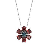 This Ruby and London Blue Topaz Necklace is casted in 14k White Gold. This Women’s Fashion necklace features exceptionally fine gemstones, on par with those found in the world's most exclusive boutiques and among the top 10% available globally. This Floral Pendant Features A Central Round Stone Surrounded By Pear-shaped Stones, Resembling Delicate Petals. This necklace comes with a complimentary 18-inch chain. Enjoy the confidence of our 30-day, stress-free return policy—with return shipping fully covered. Each piece is also accompanied by a Lifetime Warranty, ensuring lasting beauty and peace of mind.