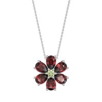 This Ruby and Peridot Necklace is casted in 14k White Gold. This Women’s Fashion necklace features exceptionally fine gemstones, on par with those found in the world's most exclusive boutiques and among the top 10% available globally. This Floral Pendant Features A Central Round Stone Surrounded By Pear-shaped Stones, Resembling Delicate Petals. This necklace comes with a complimentary 18-inch chain. Enjoy the confidence of our 30-day, stress-free return policy—with return shipping fully covered. Each piece is also accompanied by a Lifetime Warranty, ensuring lasting beauty and peace of mind.