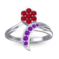 This Ruby and Amethyst ring is the perfect addition to you wardrobe. Not only do we use the top 10% of gemstones available, we also make everything right here in New York City. Our Fashion Rings can be added to your collection of dainty rings, or even to your collection of stacking rings. This Nature inspired Ring Features 7 Round Brilliant Gems Of Your Choice in A Cluster Setting Shaped Like A Flower On A Bypass Design with One Arm Of The Band Styled Like A Leaf. Ditch the worry, embrace the shine with free shipping, returns, resizing and a lifetime warranty.