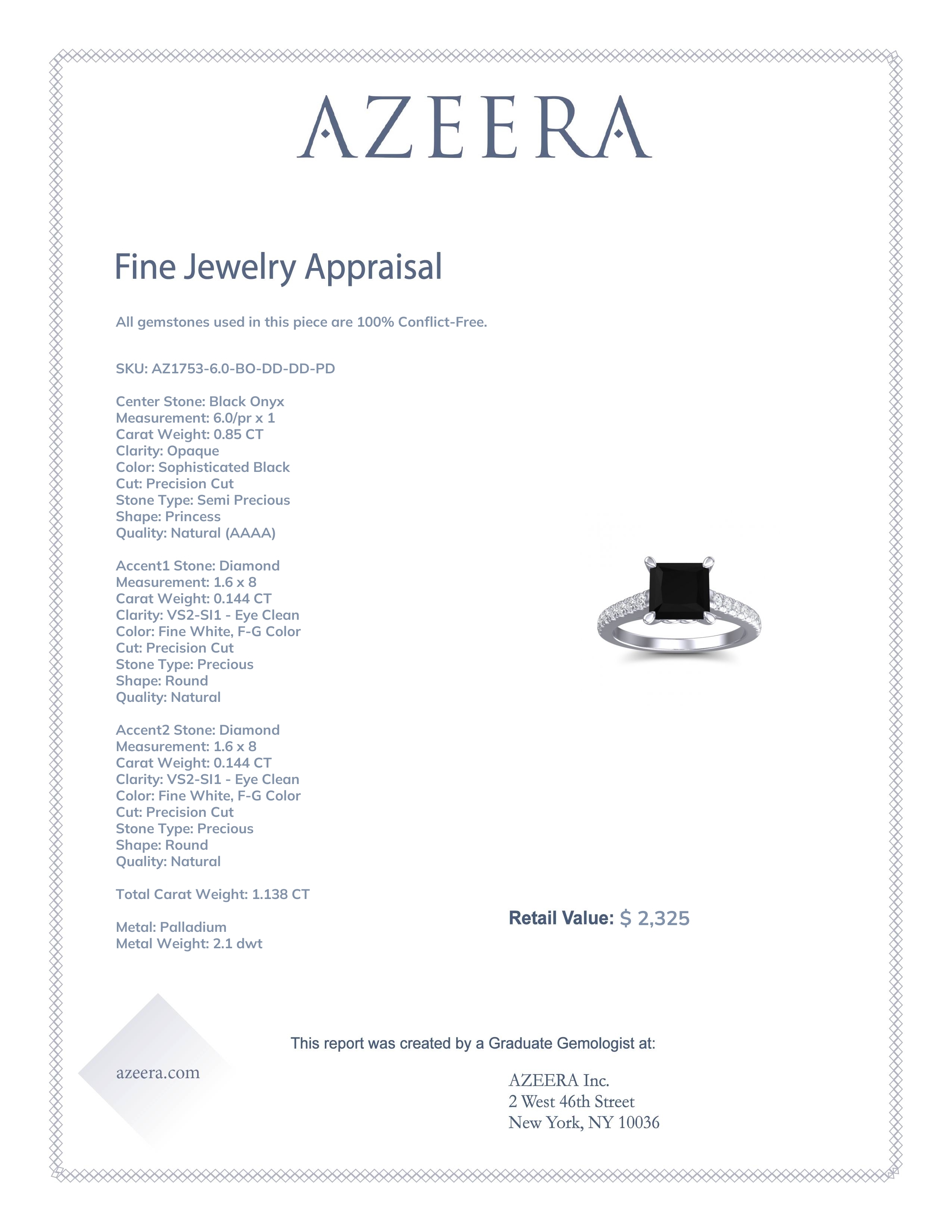 This Palladium Black Onyx ring features a Princess Black Onyx, along with fine quality Diamond. This Stunning Design Captures The Essence Of Beauty in Both Gem And Metal. The Princess Cut Center Stone Is Secured By 4 Modern Claw Prongs And Swam-like Swirls Of Precious Metal. A Cascade Of Round Brilliants Is The Perfect Accent As They Illuminate Both The Center Stone And Ring. We only use the top 10% of gems available, those found in the finest jewelry shops across the world. This Black Onyx engagement ring can also be worn as an Black Onyx and Diamond gemstone ring and added to your collection! Enjoy Free Shipping and Returns, Free Resize and a lifetime warranty.