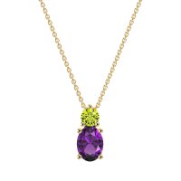 This Amethyst and Peridot Necklace is casted in 14k Yellow Gold. This Women’s Classic necklace features exceptionally fine gemstones, on par with those found in the world's most exclusive boutiques and among the top 10% available globally. Elegant Pendant Featuring A Stacked Design with A Prominent Oval Stone Beneath A Smaller Round Stone. Classic Design. This necklace comes with a complimentary 18-inch chain. Enjoy the confidence of our 30-day, stress-free return policy—with return shipping fully covered. Each piece is also accompanied by a Lifetime Warranty, ensuring lasting beauty and peace of mind.