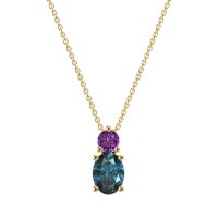 This London Blue Topaz and Amethyst Necklace is casted in 14k Yellow Gold. This Women’s Classic necklace features exceptionally fine gemstones, on par with those found in the world's most exclusive boutiques and among the top 10% available globally. Elegant Pendant Featuring A Stacked Design with A Prominent Oval Stone Beneath A Smaller Round Stone. Classic Design. This necklace comes with a complimentary 18-inch chain. Enjoy the confidence of our 30-day, stress-free return policy—with return shipping fully covered. Each piece is also accompanied by a Lifetime Warranty, ensuring lasting beauty and peace of mind.