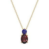 This Ruby and Blue Sapphire Necklace is casted in 14k Yellow Gold. This Women’s Classic necklace features exceptionally fine gemstones, on par with those found in the world's most exclusive boutiques and among the top 10% available globally. Elegant Pendant Featuring A Stacked Design with A Prominent Oval Stone Beneath A Smaller Round Stone. Classic Design. This necklace comes with a complimentary 18-inch chain. Enjoy the confidence of our 30-day, stress-free return policy—with return shipping fully covered. Each piece is also accompanied by a Lifetime Warranty, ensuring lasting beauty and peace of mind.