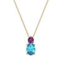This Swiss Blue Topaz and Amethyst Necklace is casted in 14k Yellow Gold. This Women’s Classic necklace features exceptionally fine gemstones, on par with those found in the world's most exclusive boutiques and among the top 10% available globally. Elegant Pendant Featuring A Stacked Design with A Prominent Oval Stone Beneath A Smaller Round Stone. Classic Design. This necklace comes with a complimentary 18-inch chain. Enjoy the confidence of our 30-day, stress-free return policy—with return shipping fully covered. Each piece is also accompanied by a Lifetime Warranty, ensuring lasting beauty and peace of mind.