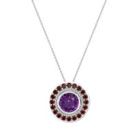 This Amethyst and Garnet Necklace is casted in 14k White Gold. This Women’s Halo necklace features exceptionally fine gemstones, on par with those found in the world's most exclusive boutiques and among the top 10% available globally. This Pendant Features A Round Stone Bezel-set inside A Milgrain Detailed Halo, And Then Surrounded By Another Halo Of Gemstones. This necklace comes with a complimentary 18-inch chain. Enjoy the confidence of our 30-day, stress-free return policy—with return shipping fully covered. Each piece is also accompanied by a Lifetime Warranty, ensuring lasting beauty and peace of mind.
