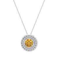 This Citrine and Lab Diamond Necklace is casted in Platinum. This Women’s Halo necklace features exceptionally fine gemstones, on par with those found in the world's most exclusive boutiques and among the top 10% available globally. This Pendant Features A Round Stone Bezel-set inside A Milgrain Detailed Halo, And Then Surrounded By Another Halo Of Gemstones. This necklace comes with a complimentary 18-inch chain. Enjoy the confidence of our 30-day, stress-free return policy—with return shipping fully covered. Each piece is also accompanied by a Lifetime Warranty, ensuring lasting beauty and peace of mind.