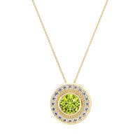 This Peridot and Lab Diamond Necklace is casted in 18k Yellow Gold. This Women’s Halo necklace features exceptionally fine gemstones, on par with those found in the world's most exclusive boutiques and among the top 10% available globally. This Pendant Features A Round Stone Bezel-set inside A Milgrain Detailed Halo, And Then Surrounded By Another Halo Of Gemstones. This necklace comes with a complimentary 18-inch chain. Enjoy the confidence of our 30-day, stress-free return policy—with return shipping fully covered. Each piece is also accompanied by a Lifetime Warranty, ensuring lasting beauty and peace of mind.