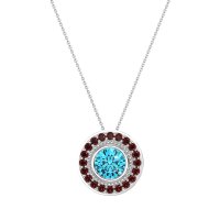 This Swiss Blue Topaz and Ruby Necklace is casted in 14k White Gold. This Women’s Halo necklace features exceptionally fine gemstones, on par with those found in the world's most exclusive boutiques and among the top 10% available globally. This Pendant Features A Round Stone Bezel-set inside A Milgrain Detailed Halo, And Then Surrounded By Another Halo Of Gemstones. This necklace comes with a complimentary 18-inch chain. Enjoy the confidence of our 30-day, stress-free return policy—with return shipping fully covered. Each piece is also accompanied by a Lifetime Warranty, ensuring lasting beauty and peace of mind.