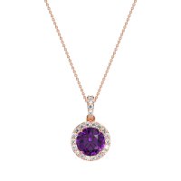This Amethyst and Lab Diamond Necklace is casted in 18K Rose Gold. This Women’s Halo necklace features exceptionally fine gemstones, on par with those found in the world's most exclusive boutiques and among the top 10% available globally. This Pendant Features A Round-cut Central Stone Encircled By A Halo Of Smaller Stones. This necklace comes with a complimentary 18-inch chain. Enjoy the confidence of our 30-day, stress-free return policy—with return shipping fully covered. Each piece is also accompanied by a Lifetime Warranty, ensuring lasting beauty and peace of mind.