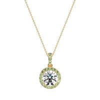 This Diamond and Peridot Necklace is casted in 14k Yellow Gold. This Women’s Halo necklace features exceptionally fine gemstones, on par with those found in the world's most exclusive boutiques and among the top 10% available globally. This Pendant Features A Round-cut Central Stone Encircled By A Halo Of Smaller Stones. This necklace comes with a complimentary 18-inch chain. Enjoy the confidence of our 30-day, stress-free return policy—with return shipping fully covered. Each piece is also accompanied by a Lifetime Warranty, ensuring lasting beauty and peace of mind.