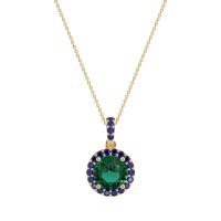 This Emerald and Blue Sapphire Necklace is casted in 14k Yellow Gold. This Women’s Halo necklace features exceptionally fine gemstones, on par with those found in the world's most exclusive boutiques and among the top 10% available globally. This Pendant Features A Round-cut Central Stone Encircled By A Halo Of Smaller Stones. This necklace comes with a complimentary 18-inch chain. Enjoy the confidence of our 30-day, stress-free return policy—with return shipping fully covered. Each piece is also accompanied by a Lifetime Warranty, ensuring lasting beauty and peace of mind.