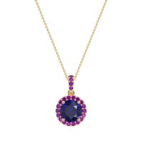 This Lab Blue Sapphire and Amethyst Necklace is casted in 14k Yellow Gold. This Women’s Halo necklace features exceptionally fine gemstones, on par with those found in the world's most exclusive boutiques and among the top 10% available globally. This Pendant Features A Round-cut Central Stone Encircled By A Halo Of Smaller Stones. This necklace comes with a complimentary 18-inch chain. Enjoy the confidence of our 30-day, stress-free return policy—with return shipping fully covered. Each piece is also accompanied by a Lifetime Warranty, ensuring lasting beauty and peace of mind.
