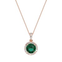 This Lab Emerald and Lab Diamond Necklace is casted in 14K Rose Gold. This Women’s Halo necklace features exceptionally fine gemstones, on par with those found in the world's most exclusive boutiques and among the top 10% available globally. This Pendant Features A Round-cut Central Stone Encircled By A Halo Of Smaller Stones. This necklace comes with a complimentary 18-inch chain. Enjoy the confidence of our 30-day, stress-free return policy—with return shipping fully covered. Each piece is also accompanied by a Lifetime Warranty, ensuring lasting beauty and peace of mind.