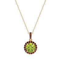 This Peridot and Ruby Necklace is casted in 14k Yellow Gold. This Women’s Halo necklace features exceptionally fine gemstones, on par with those found in the world's most exclusive boutiques and among the top 10% available globally. This Pendant Features A Round-cut Central Stone Encircled By A Halo Of Smaller Stones. This necklace comes with a complimentary 18-inch chain. Enjoy the confidence of our 30-day, stress-free return policy—with return shipping fully covered. Each piece is also accompanied by a Lifetime Warranty, ensuring lasting beauty and peace of mind.
