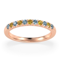 This Aquamarine wedding ring is casted in 18K Rose Gold and set with fine quality Aquamarine and Citrine. All of the gemstones we use are of the top 10% available, those found in fine quality boutiques across the world. This Aquamarine wedding band can also be added to your collection of minimalist Aquamarine rings. This Band Showcases Round Stones in A Scallop Setting, with Delicate Milgrain Edging The Shank. Free shipping, returns, resizing, and a lifetime warranty ensure you love your purchase.