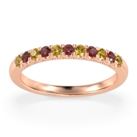 This Citrine wedding ring is casted in 14K Rose Gold and set with fine quality Citrine and Ruby. All of the gemstones we use are of the top 10% available, those found in fine quality boutiques across the world. This Citrine wedding band can also be added to your collection of minimalist Citrine rings. This Band Showcases Round Stones in A Scallop Setting, with Delicate Milgrain Edging The Shank. Free shipping, returns, resizing, and a lifetime warranty ensure you love your purchase.