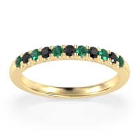This Emerald wedding ring is casted in 14k Yellow Gold and set with fine quality Emerald and Black Onyx. All of the gemstones we use are of the top 10% available, those found in fine quality boutiques across the world. This Emerald wedding band can also be added to your collection of minimalist Emerald rings. This Band Showcases Round Stones in A Scallop Setting, with Delicate Milgrain Edging The Shank. Free shipping, returns, resizing, and a lifetime warranty ensure you love your purchase.